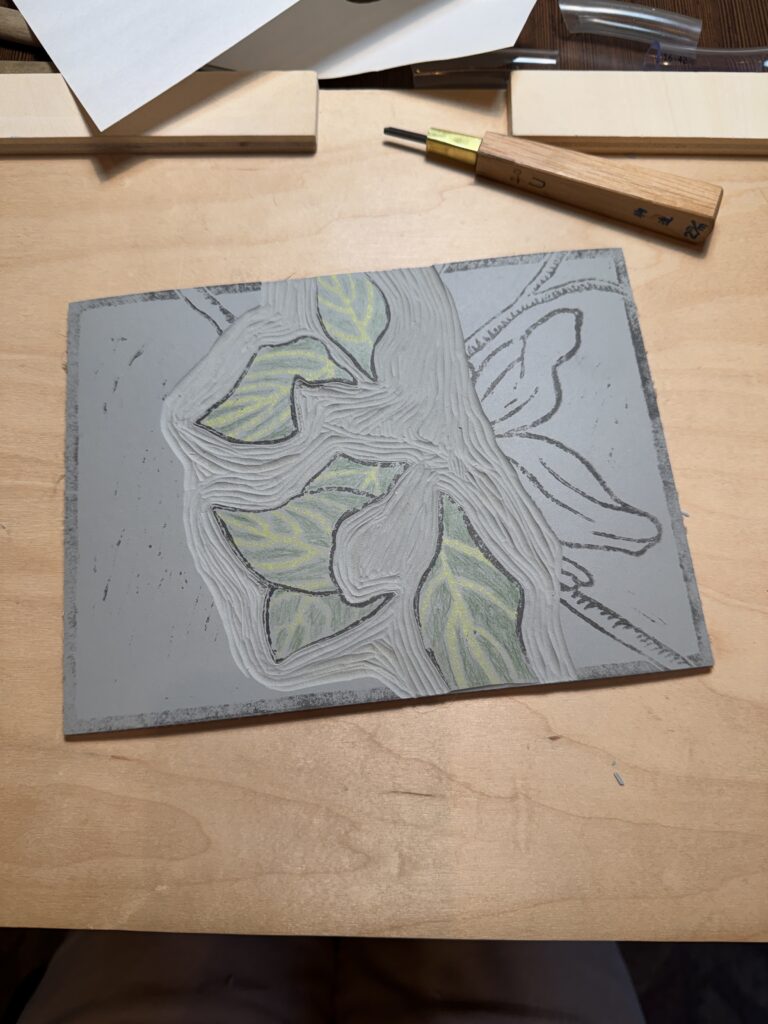 Next have a simple t-shirt pattern on hand that fits you well, the way you like to wear your shirts. Note that often the fabric used in men’s shirts, while beefy and durable, might not have as much stretch and recovery as what you are used to sewing with if you make tees for yourself. If it’s really stiff, you may need to go up a size. I use Jalie 2805 for this and I do go up a size from my usual U to V. You see the shirt I’m going to use and the pattern set out and ready to go. Note that the shirt has been washed and dried in the same way that I plan to launder the final shirt: